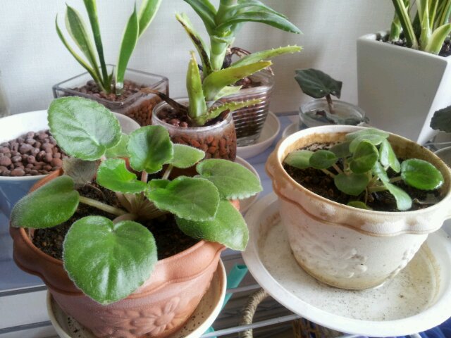挿し葉から育てたセントポーリアたちが、大きくなって元気です。窓際に置いているので日の当たるほうへ葉が傾くので、たまに鉢を回転させてます。