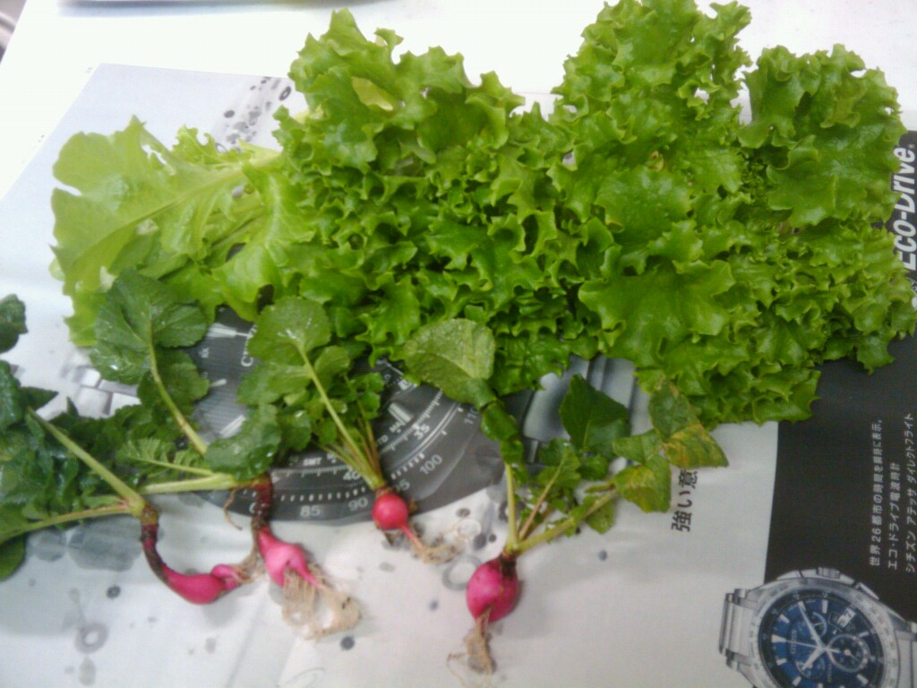 大きくなりすぎた?レタスと、きれいに丸くならなかったハツカダイコンを収穫しました。夕食のサラダに入れていただきます。