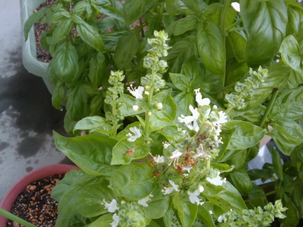 元気に成長中のバジルの花を摘みました。そのままにしておくと葉がかたくなるみたいです。先週末に手入れができなかったので今朝、摘みました。