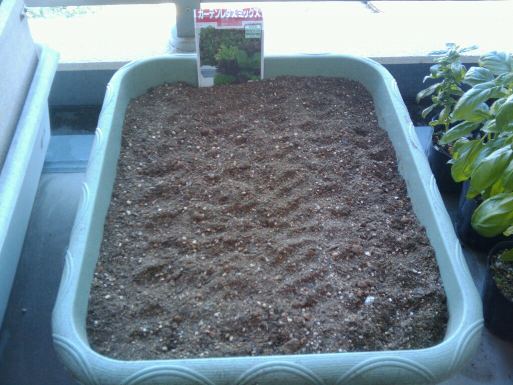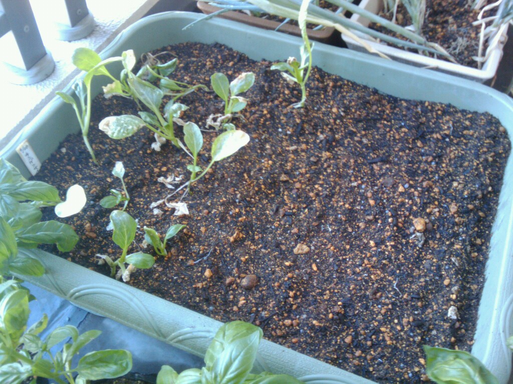 やっと、チンゲン菜を植え替えました。だいぶ、しおれてしまっていたので、元気のいいものを植え替えました。手前側には、種を蒔いておきました。