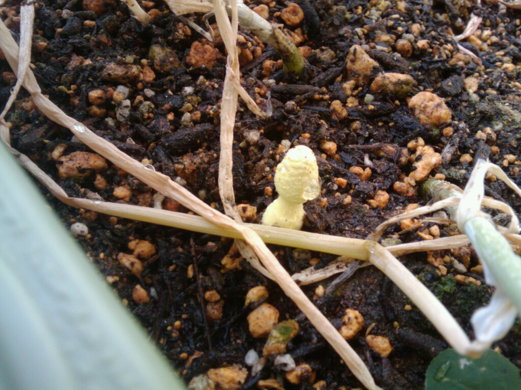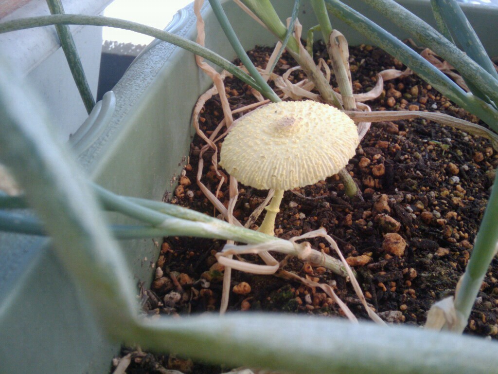 ネギの植えてあるプランターにこんな、キノコみたいのが生えてきた。なんだ?これは?